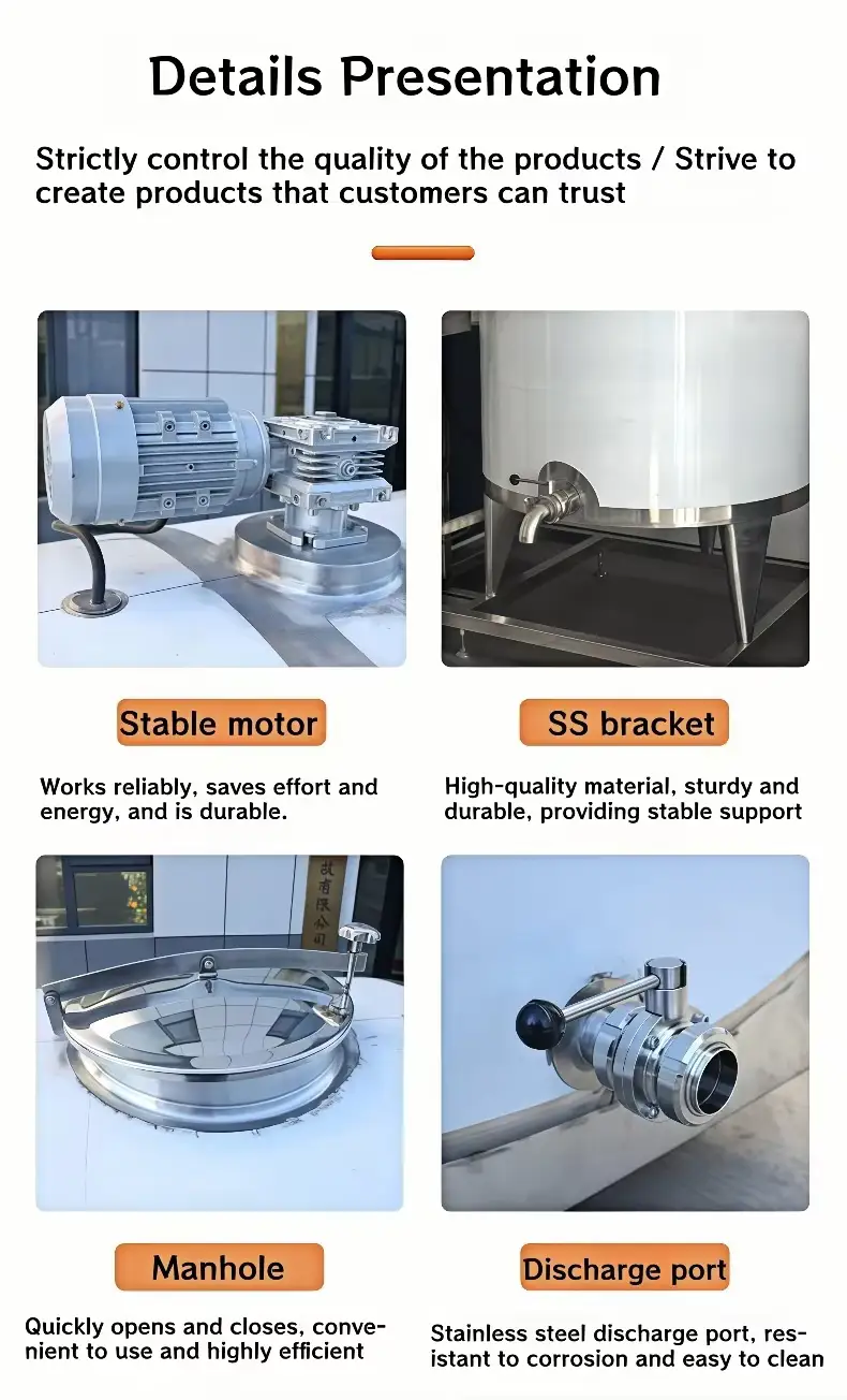 - Auxiliary Accessories: Includes safety valve, breathing valve, inlet/outlet valves, and an easy-to-clean sanitary structure.