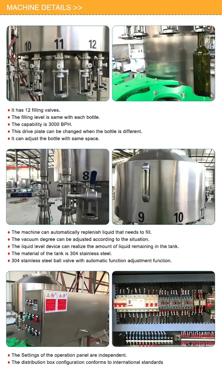 - Filling Nozzles: Available in customizable configurations (12/18/24/36/40/48 nozzles), allowing production to match specific capacity requirements. The nozzles are designed to prevent dripping and ensure clean bottle filling.